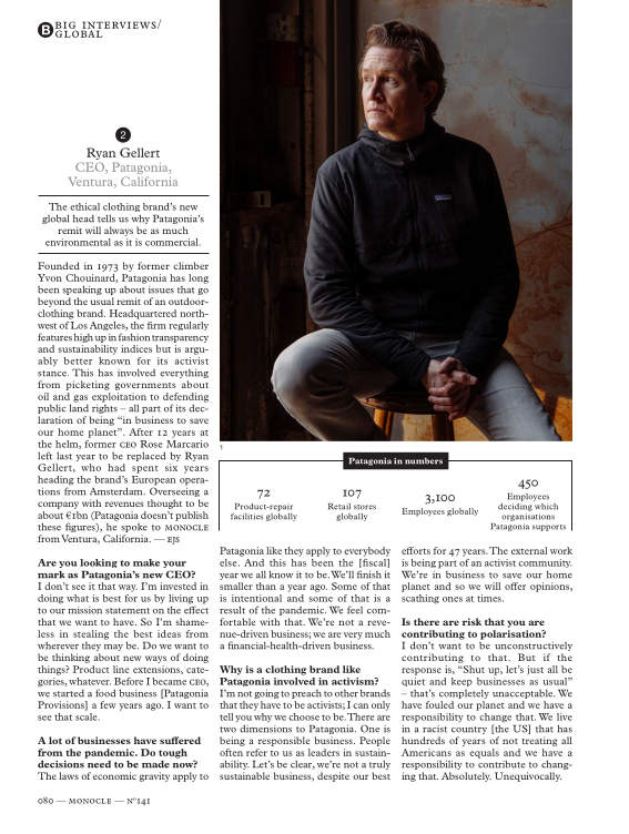 Founded in 1973 by former climber Yvon Chouinard, Patagonia has long been speaking up about issues that go beyond the usual remit of an outdoor-clothing brand. Headquartered northwest of Los Angeles, the firm regularly features high up in fashion transparency and sustainability indices but is arguably better known for its activist stance. This has involved everything from picketing governments about oil and gas exploitation to defending public land rights – all part of its declaration of being “in business to save our home planet”. After 12 years at the helm, former ceo Rose Marcario left last year to be replaced by Ryan Gellert, who had spent six years heading the brand’s European operations from Amsterdam. Overseeing a company with revenues thought to be about €1bn (Patagonia doesn’t publish these figures), he spoke to Monocle from Ventura, California.