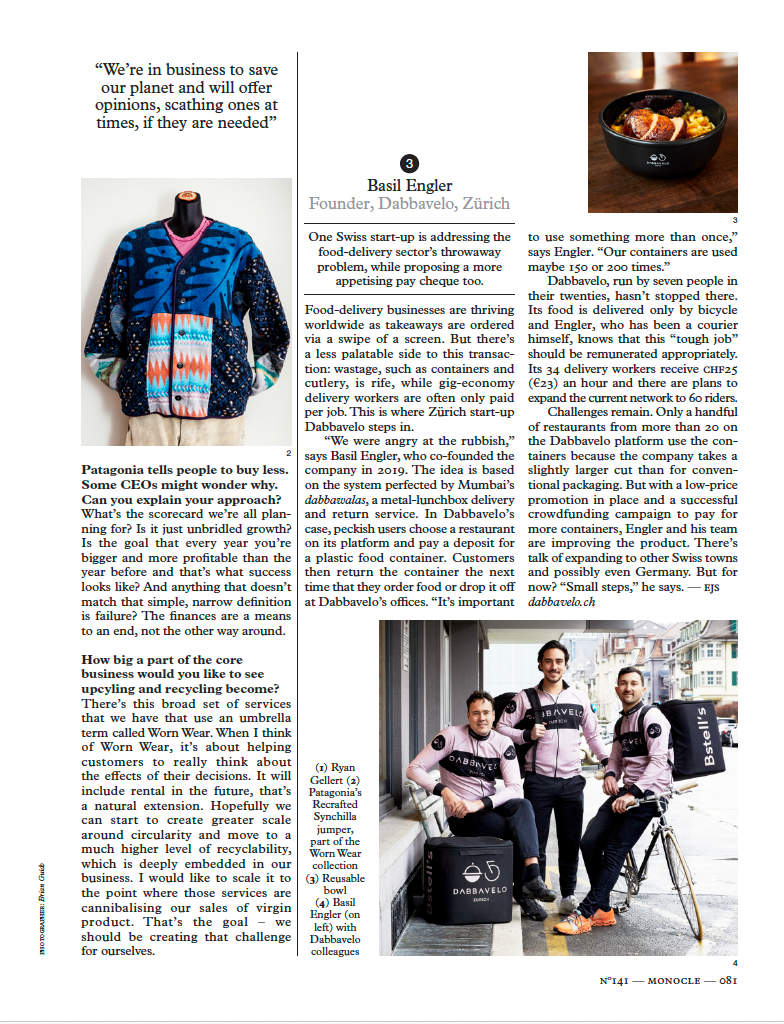 “We were angry at the rubbish,” says Basil Engler, who co-founded the company in 2019. The idea is based on the system perfected by Mumbai’s dabbawalas, a metal-lunchbox delivery and return service. In Dabbavelo’s case, peckish users choose a restaurant on its platform and pay a deposit for a plastic food container. Customers then return the container the next time that they order food or drop it off at Dabbavelo’s offices. “It’s important to use something more than once,” says Engler. “Our containers are used maybe 150 or 200 times.