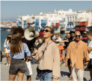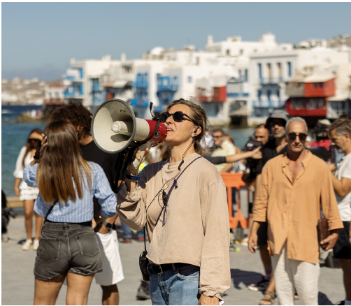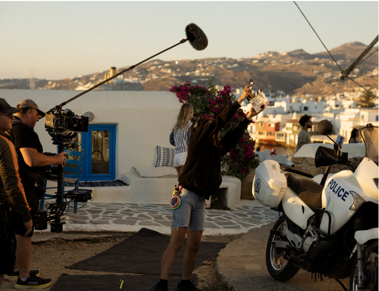 Given that the characters in Marks’s Mykonos film are from different parts of the world, English is the predominant language as the drama unfolds. But if two Greek characters are speaking, then the scene plays out in their native tongue. Most of the crew are Greek, as are some of the producers, including basketball player Giannis Antetokounmpo, who has a production role via his company Improbable Media. But there are also Italian, French, Spanish and Turkish speakers on set. They are joined by international on-screen talent including the likes of US actor Vito Schnabel and Italy’s Riccardo Scamarcio. “The ensemble aspect of the film was key for me,” says Marks. “Ocean’s Eleven was shot with Brad Pitt, Matt Damon and Bernie Mac. I really wanted to have that same kind of team, where every single actor could carry a film on their own.” Still, Marks admits that the budget for the shoot is modest, though co-producer Ginevra Tamberi is quick to add that it is on a par with some other European films.