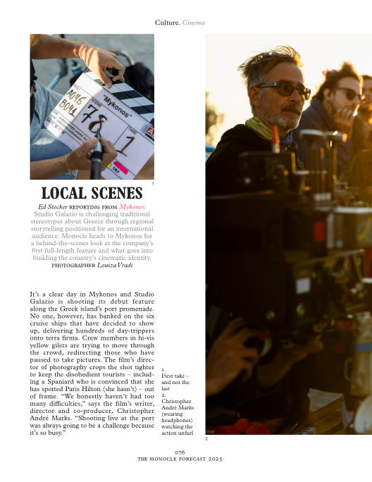 Studio Galazio is challenging traditional stereotypes about Greece through regional storytelling positioned for an international audience. Monocle heads to Mykonos for a behind-the-scenes look at the company’s first full-length feature and what goes into building the country’s cinematic identity.