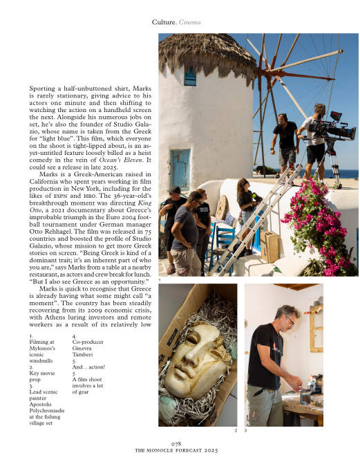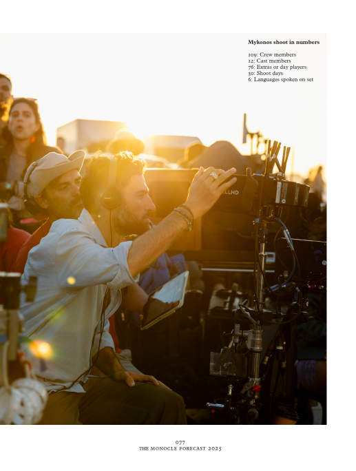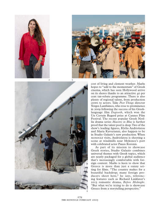 Marks is quick to recognise that Greece is already having what some might call “a moment”. The country has been steadily recovering from its 2009 economic crisis, with Athens luring investors and remote workers as a result of its relatively low cost of living and clement weather. Marks hopes to “add to the momentum” of Greek cinema, which has seen Hollywood arrive on its shores thanks to an attractive 40 per cent tax-rebate programme. There is also plenty of regional talent, from production crews to actors. Take Poor Things director Yorgos Lanthimos, who rose to prominence in 2009 following the success of his Greek-language film Dogtooth, which won the Un Certain Regard prize at Cannes Film Festival. The recent popular Greek Netflix drama series Maestro in Blue is further proof that the talent pool is deep. Two of the show’s leading figures, Klelia Andriolatou and Maria Kavoyianni, also happen to be in Studio Galazio’s new production. When monocle visits, Andriolatou is shooting a scene at windmills near Mykonos’s port with celebrated actor Panos Koronis.