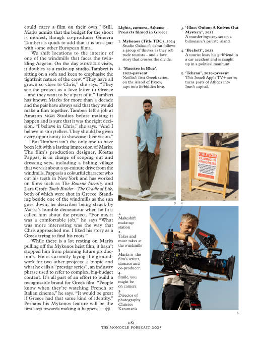 We shift locations to the interior of one of the windmills that faces the twinkling Aegean. On the day monocle visits, it doubles as a make-up studio. Tamberi is sitting on a sofa and keen to emphasise the tightknit nature of the crew. “They have all grown so close to Chris,” she says. “They see the project as a love letter to Greece – and they want to be a part of it.” Tamberi has known Marks for more than a decade and the pair have always said that they would make a film together. Tamberi left a job at Amazon mgm Studios before making it happen and is sure that it was the right decision. “I believe in Chris,” she says. “And I believe in storytellers. They should be given every opportunity to showcase their vision.”