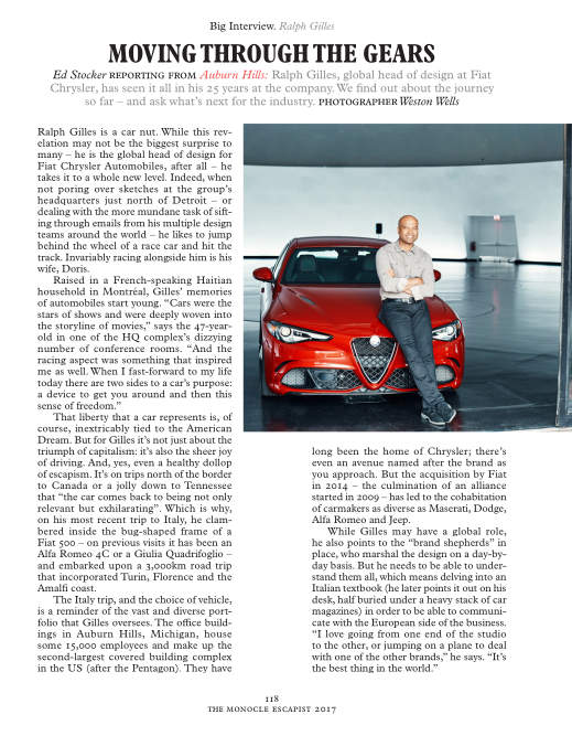 Ralph Gilles is a car nut. While this rev­elation may not be the biggest surprise to many – he is the global head of design for Fiat Chrysler Automobiles, after all – he takes it to a whole new level. Indeed, when not poring over sketches at the group’s headquarters just north of Detroit – or dealing with the more mundane task of sift­ing through emails from his multiple design teams around the world – he likes to jump behind the wheel of a race car and hit the track. Invariably racing alongside him is his wife, Doris.