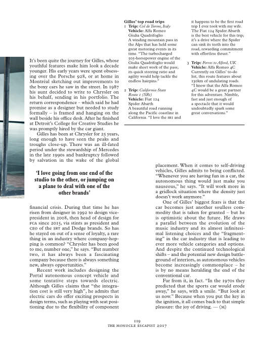 One of Gilles’ biggest fears is that the car becomes just another soulless com­modity that is taken for granted – but he is optimistic about the future. He draws a parallel between the evolution of the music industry and its almost infinitesi­mal listening choices and the “fragment­ing” in the car industry that is leading to ever more vehicle categories and options. And despite the continued technological shifts – and the potential new design battle­ground of interiors, as autonomous vehicles become increasingly commonplace – he is by no means heralding the end of the conventional car.