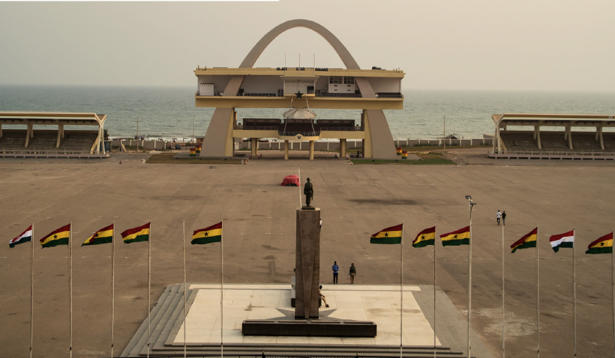 It’s golden hour in Accra and amateur photographers have their phones at the ready. The backdrop is the Ghanaian capital’s Black Star Square and the modernist curve of Independence Arch. As a breeze drifts in from the Atlantic, those who are about to be snapped raise their arms and jab their fingers towards the cameras. The stance is a reference to the rallying cry of Ghana’s first post-independence president, Kwame Nkrumah: “Forward ever, backwards never!” In 1961 his government completed this flag-lined gathering space, where people now lounge on seats near the arch. As statement architecture, it remains highly effective.
