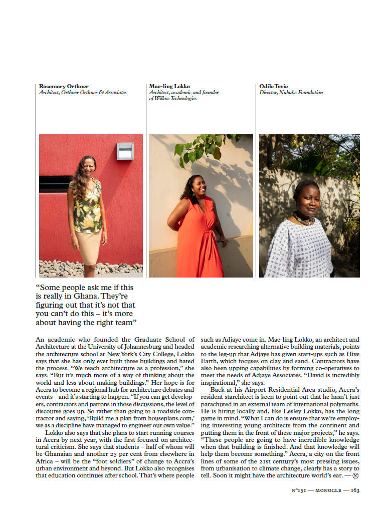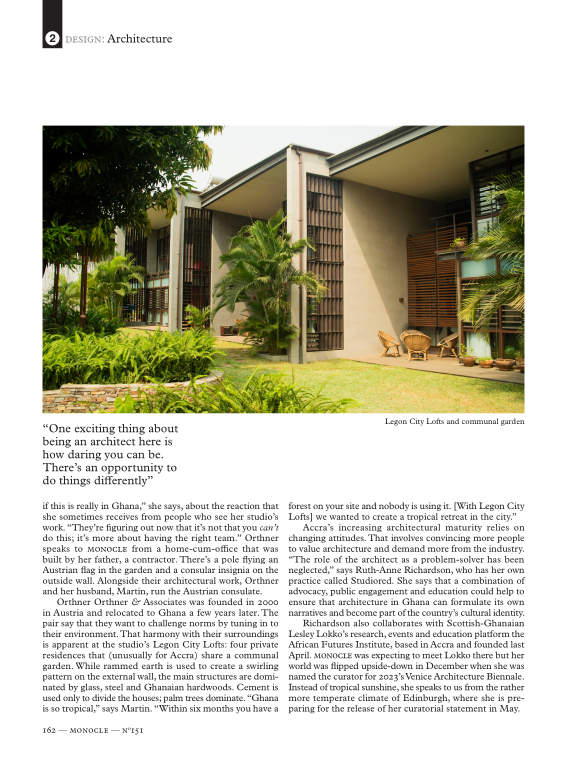 Richardson also collaborates with Scottish-Ghanaian Lesley Lokko’s research, events and education platform the African Futures Institute, based in Accra and founded last April. monocle was expecting to meet Lokko there but her world was flipped upside-down in December when she was named the curator for 2023’s Venice Architecture Biennale. Instead of tropical sunshine, she speaks to us from the rather more temperate climate of Edinburgh, where she is preparing for the release of her curatorial statement in May.
