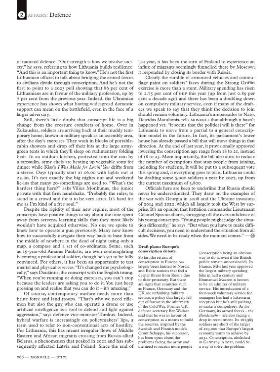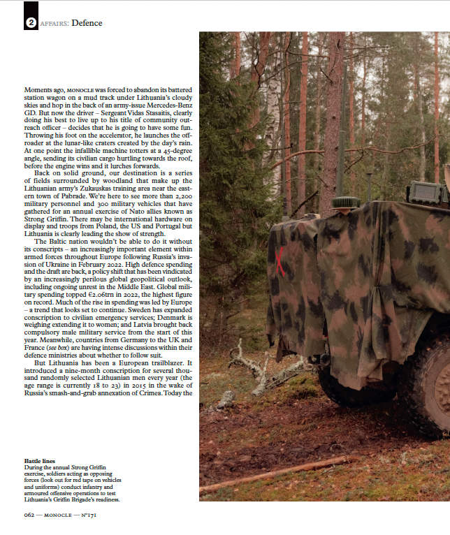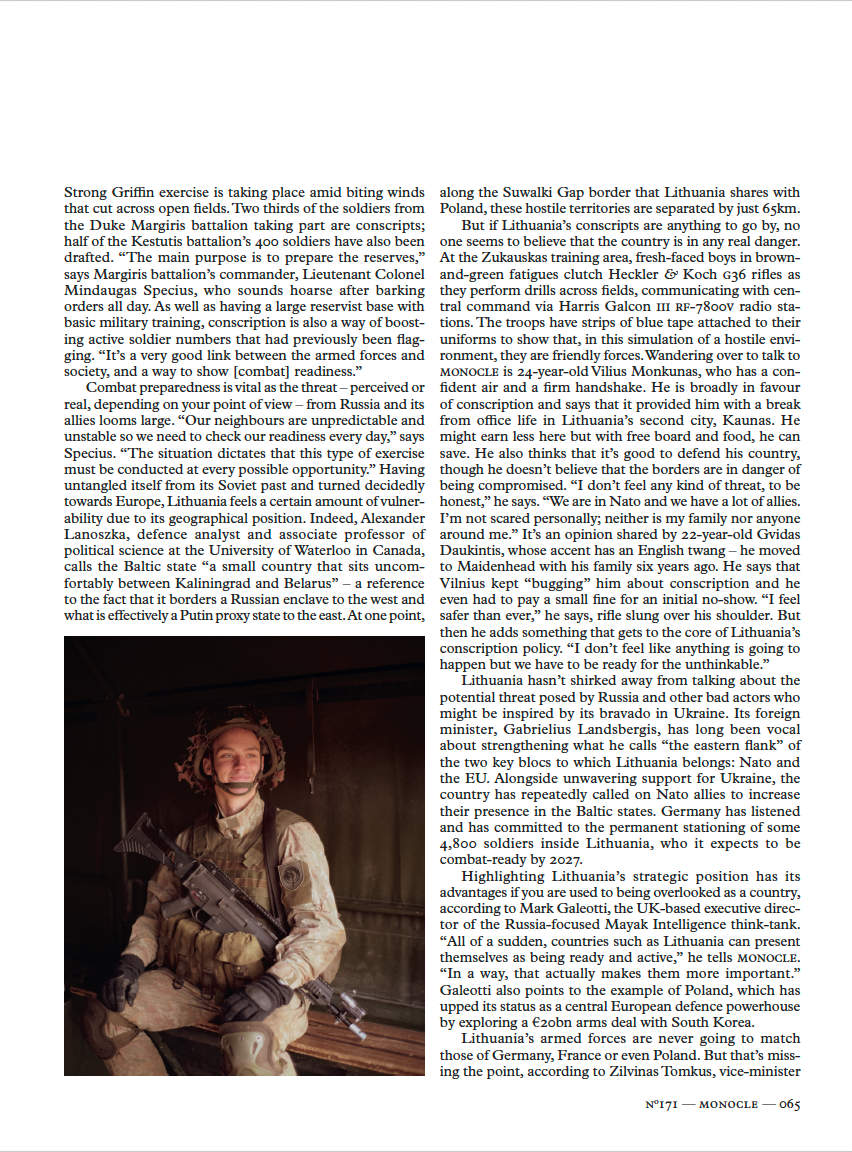 Clearly the rumble of armoured vehicles and camouflage paint on soldiers’ faces during the Strong Griffin exercise is more than a stunt. Military spending has risen to 2.75 per cent of gdp this year (up from just 0.89 per cent a decade ago) and there has been a doubling down on compulsory military service, even if many of the draftees we speak to say that they think the decision to join should remain voluntary. Lithuania’s ambassador to Nato, Deividas Matulionis, tells Monocle that although it hasn’t happened yet, “it seems that the political will is there” for Lithuania to move from a partial to a general conscription model in the future. In fact, its parliament’s lower house has already passed a bill that will move things in that direction. At the end of last year, it provisionally approved lowering the conscription age range from 18 to 21, instead of 18 to 23. More importantly, the bill also aims to reduce the number of exemptions that stop people from joining, including for students. It will be put to a subsequent vote this spring and, if everything goes to plan, Lithuania could be drafting some 5,000 soldiers a year by 2027, up from the current maximum of 3,800.
