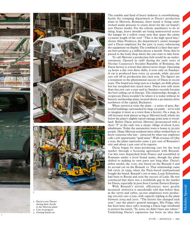 When Monocle visits the plant – a series of grey, flat-roofed buildings surrounded by large car parks – we’re told to imagine it more as a town than a factory. On a map, its 288 hectares look almost as big as Mioveni itself, which sits below the plant’s slightly raised vantage point next to wood­land. Before Dacia arrived, Mioveni (pronounced with a short “I” at the end) was a sleepy village of about 6,000 inhabitants. Today the automotive town is home to 30,000 people. Many Mioveni residents have either worked here or know someone who has – attracted by what one employee calls a job opportunity “gold mine”. With revenue of €5bn a year, the plant represents some 2 per cent of Romania’s GDP and about 2 per cent of its exports.