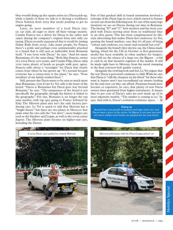 Underlying Dacia’s expansion has been an idea that counters the trends of the automobile industry. There has been a push back against the expensive bells-and-whistles cars that had already started to come onto the market at the end of the 1990s. “The idea was to say, what if we have a piece of the group that would not play the game of always more,” Dacia’s ceo Denis le Vot, also group chief supply chain officer, tells Monocle. Under Renault’s stewardship, Dacia launched the no-nonsense Logan model in saloon and estate versions, which came with wind-down windows and no air conditioning.